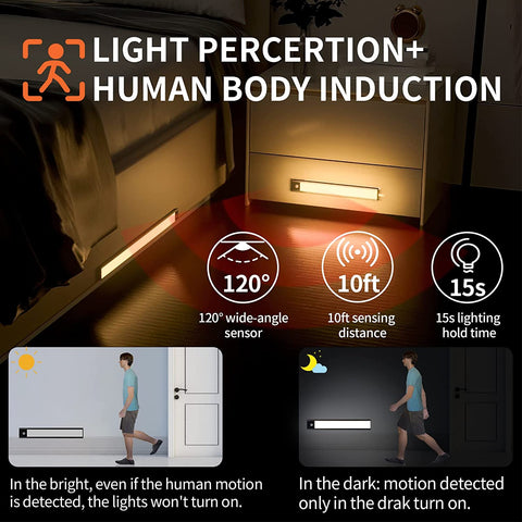 • 🚶🏽【Sensitive Motion Detection】: Motion sensor cabinet lights with passive infrared technology (PIR) detects human motion to automatically turn on in the dark. These Motion Sensor Closet Lights have a 10ft, 120° sensor range. If you keep moving within the sensing range, under cabinet light will keep on. Automatically turns off after 15 seconds with no motion. ONLY WORKS IN THE DARK IN Auto2 mode. Light sensor detects other lights and won’t switch on in the light. Super saving energy!